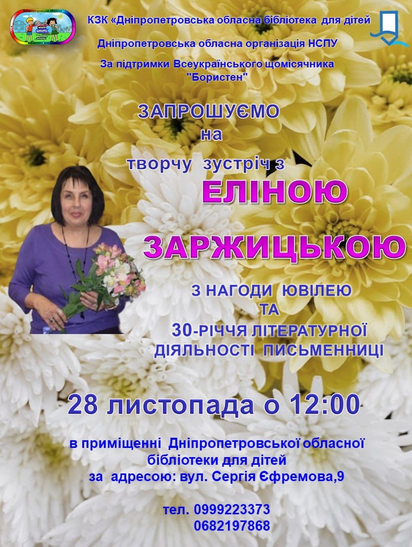 На базі Дніпропетровської обласної бібліотеки для дітей відбулася онлайн зустріч члена Національної спілки письменників України, дитячої письменниці Еліни Заржицької з читачами з м. Кам'янське.